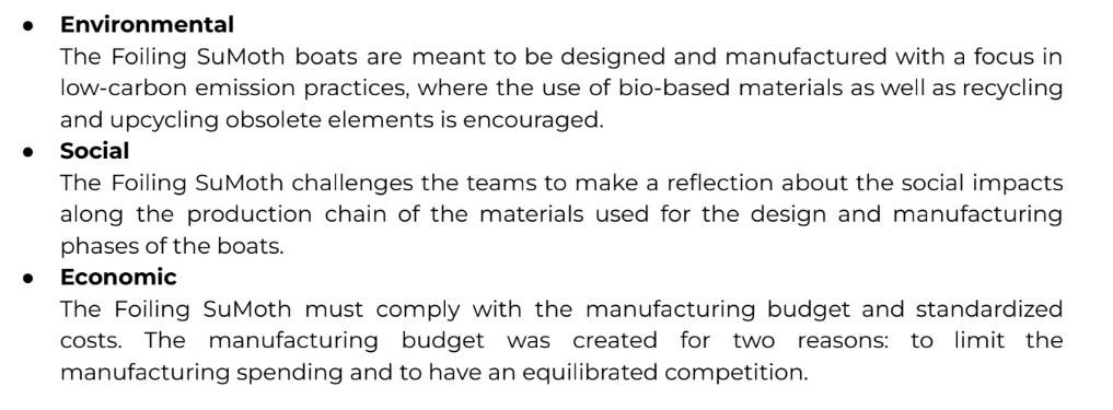 Foiling SuMoth Challenge, Su för sustainable, är en tävling för studenter med fokus på att hitta nya innovativa sätt att mixa in hållbarhet i en high performance racing-klass. Varje lag får en fiktiv budget om 10 000 Su$ där biomaterial, och återanvända material, är gratis.