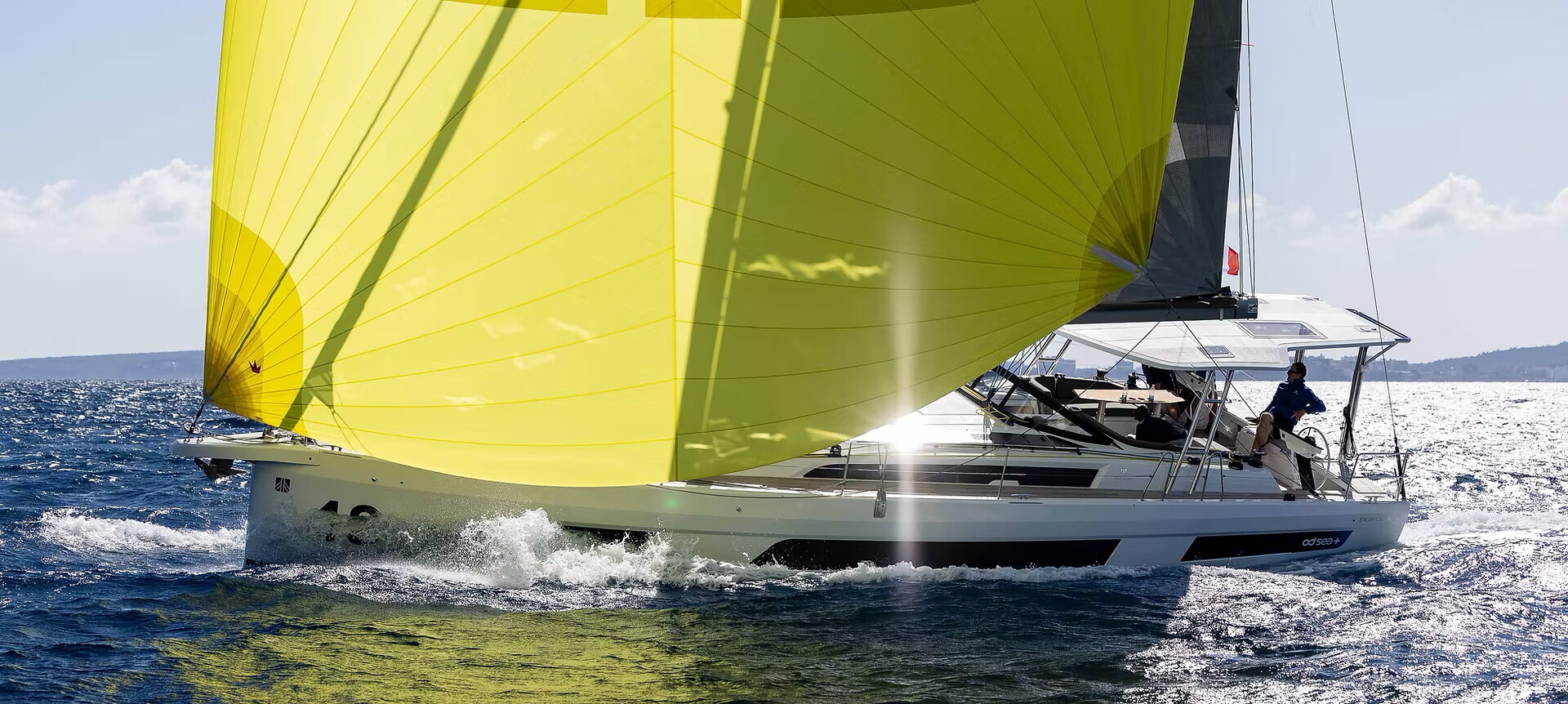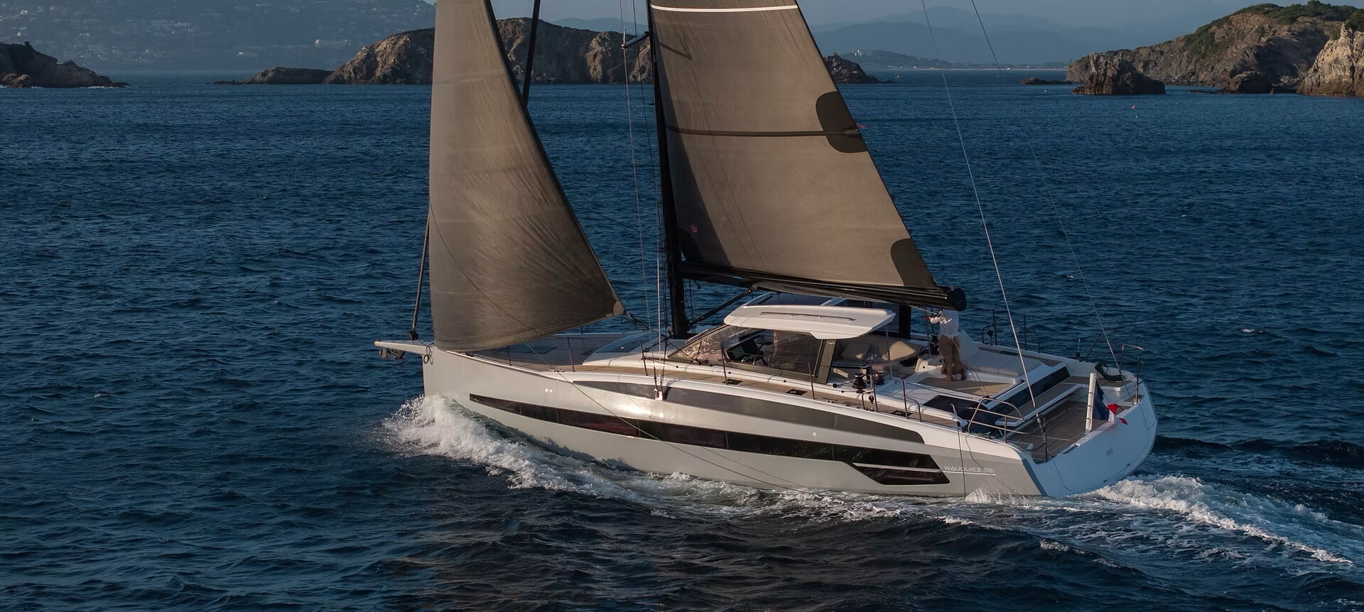 Några specifikationer för Dufour 48: Längd 15,29 m >>> Bredd 4,85 m >>> Djupgående 2,35 m / 1,75 m >>> Deplacement 13,9 ton.