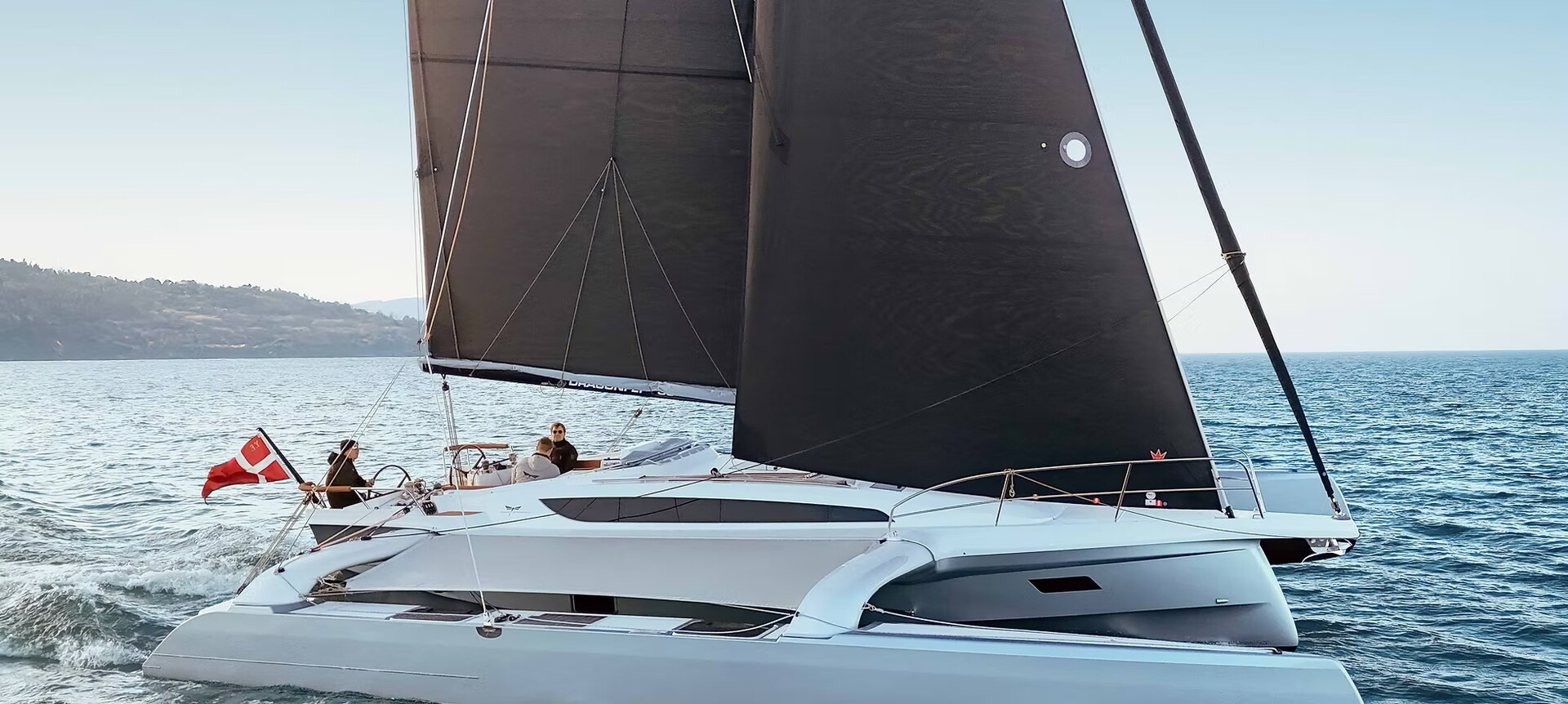 Några specifikationer för Dragonfly 36: Längd 11,55 m >>> Bredd 8,12 m >>> Djupgående 2,00 / 0,67 m >>> Deplacement 4,5 ton.