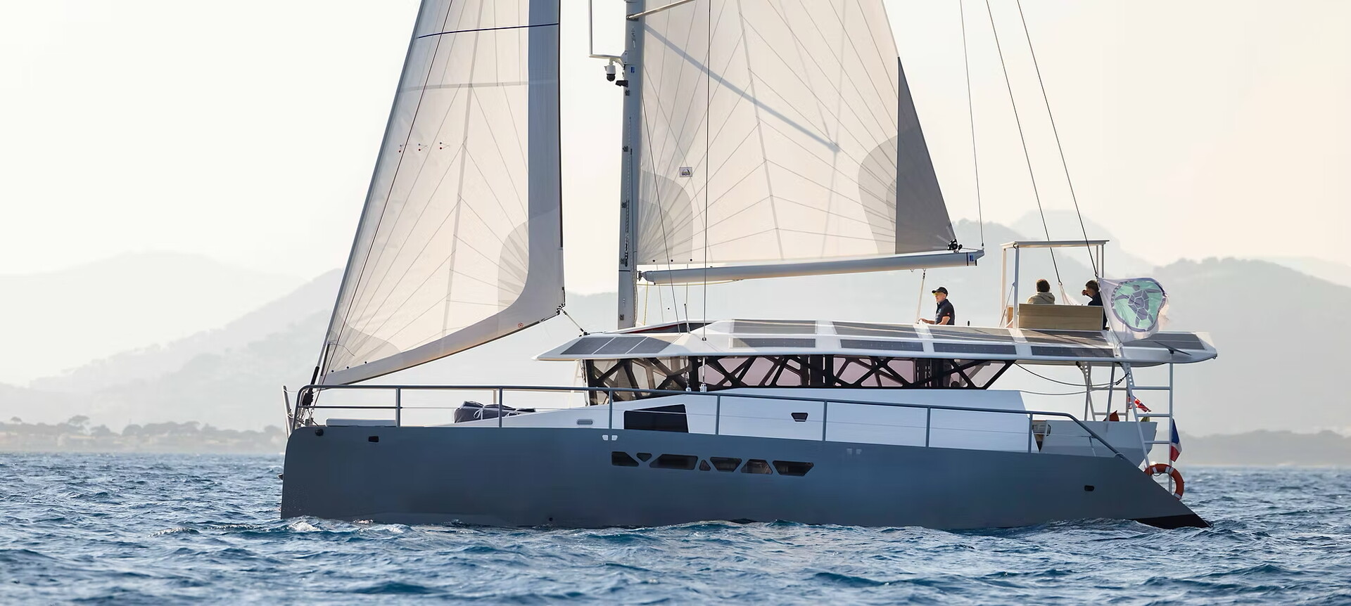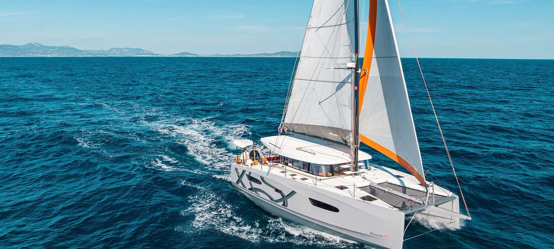 Några specifikationer för Excess 13: Längd 12,99 m >>> Bredd 7,25 m >>> Djupgående 1,48 m >>> Deplacement 10,6 ton.