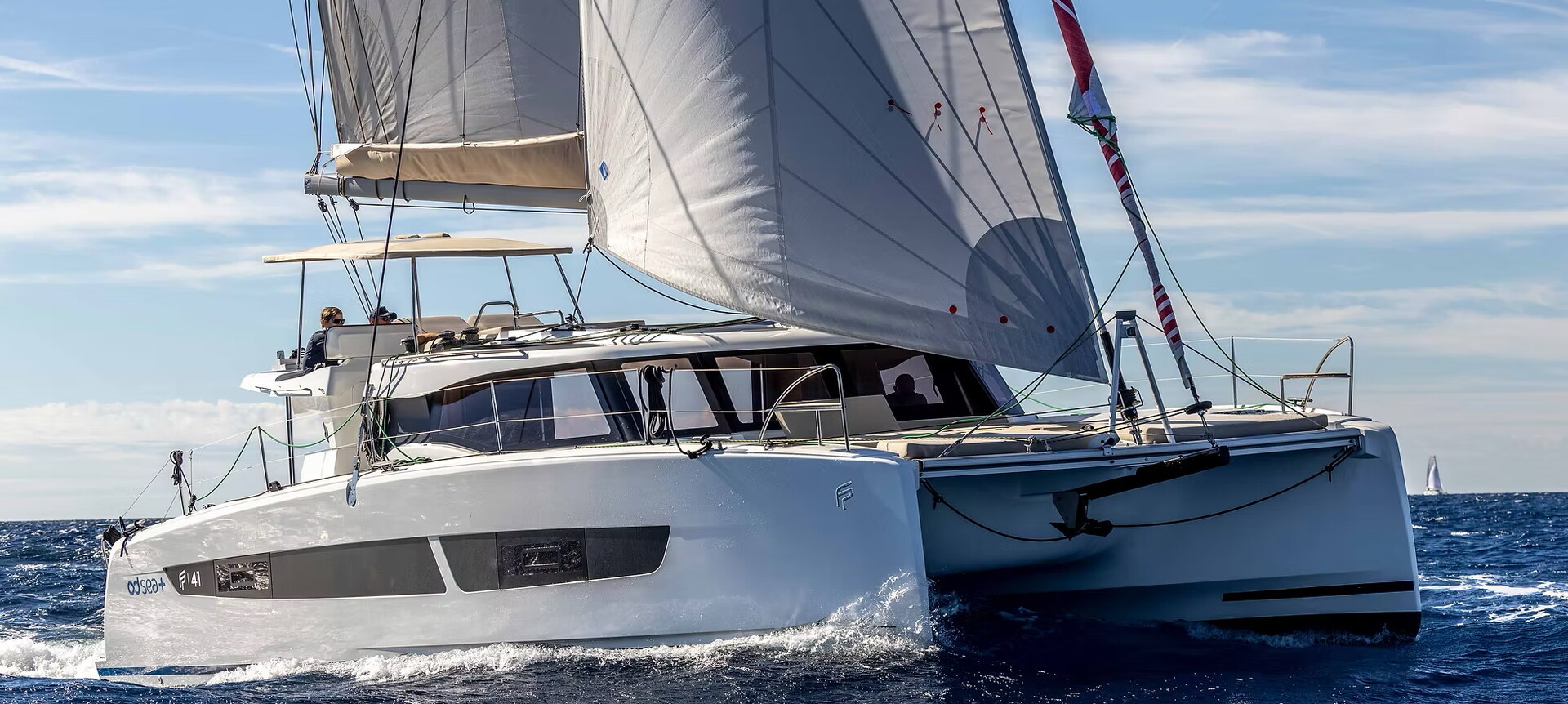 Några specifikationer för Fountain Pajot 41: Längd 12,10 m >>> Bredd 6,92 m >>> Djupgående 1,35 m >>> Deplacement 12,4 ton.