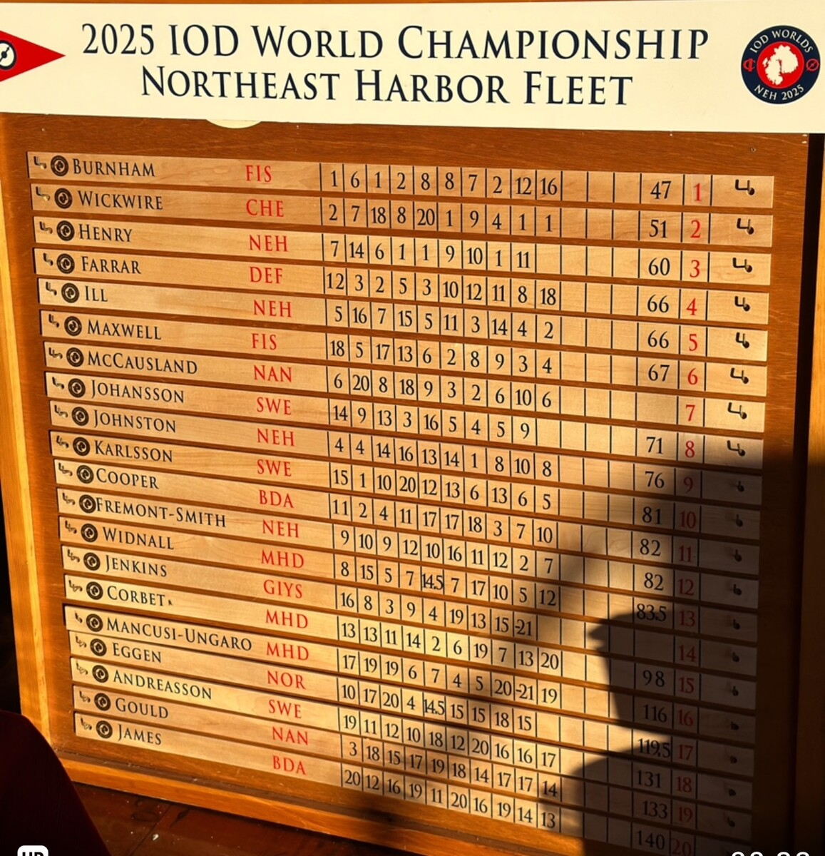 Efter en vecka med intensiv segling stod Fishers Islands Team Norwegian wood, lett av rutinerade John Burnham, högst på prispallen. Ombord fanns Beth Scholle, Jennifer Parsons, Oliver Parsons och Thomas Walker. Segern betyder att Burnham erövrar sin femte världsmästartitel – och befäster Fishers Islands dominans: öns seglare har tagit hem åtta av de senaste nio IOD-Worlds.