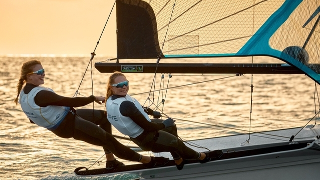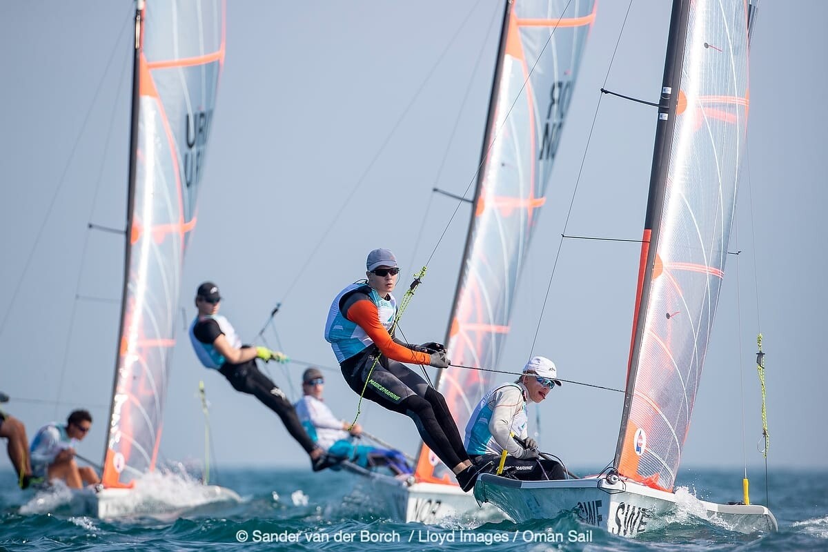Årets mottagare av stipendier från Peter Klocks minnesfond heter Malcolm Björsson och Johan Bengtsson. Killarna har genom hård träning gjort imponerande framsteg tillsammans i 29er-klassen. Under 2021 vann besättningen det svenska kvalet till UVM i 29er. På UVM som seglades i Oman i december placerade de sig på en bra 15:e plats. Framstegen har gjorts tack vare att båda två är riktiga fighters, de har tränat väldigt mycket och verkligen kämpat för att nå framgång. Foto: Sander van der Borch / Lloyd Imgaes / Oman Sails