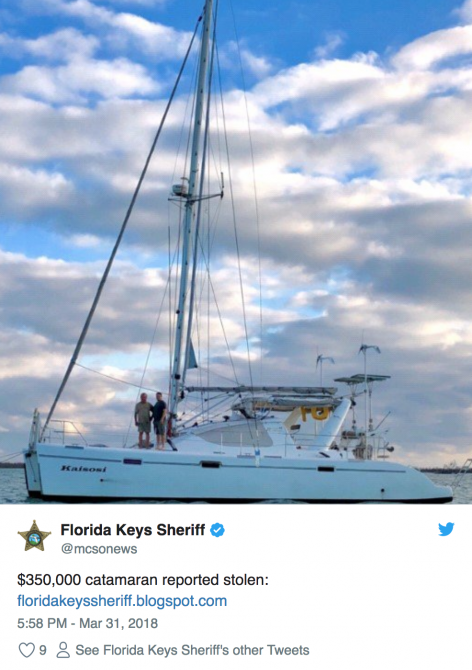 Admiralkatamaranen ”Kaisosi”, som är värd 350.000$, har rapporterats som stulen från Newfound Harbour i Florida.