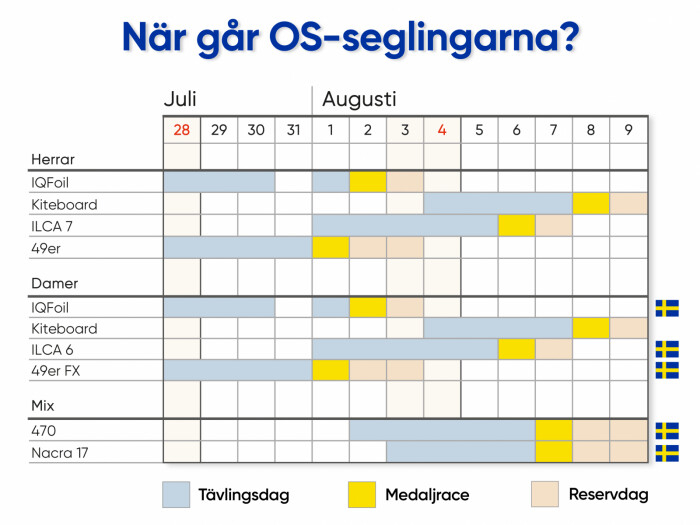Seglingarna pågår från 28 juli till 8 augusti (reservdag 9 aug). Flera av klasserna pågår parallellt och seglas samtidigt. Det finns fyra olika banorna (observera att seglingstävlingarna inte går av stapeln i Paris, utan på vattnet utanför Marseille). Minst ett svenskt team seglar varje dag under perioden. Medaljracen seglas den 1-2 augusti samt 6-7 augusti.