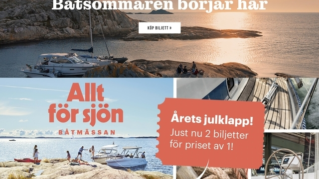 Båtmässan är för många startskottet på säsongen. Här finns allt som gör livet på och kring vattnet bättre, skönare, enklare, säkrare och roligare. Utbudet av tillbehör och utrustning är stort. Det finns även många roliga aktiviteter, spännande scenprogram och trevliga restauranger att välja och vraka mellan. Varför inte uppleva den tillsammans? Båtmässan i Göteborg går av stapeln den 3-11 februari. Båtmässan Allt för sjön i Stockholm sträcker mellan den 7-10 och 14-17 mars. Biljetter hittar du på batmassan.se (Göteborg / Västkusten) respektive www.alltforsjon.se (Stockholm / Ostkusten). Observera att du just nu får två biljetter till priset av en till Allt för sjön. Erbjudandet gäller fram till den 31 december.