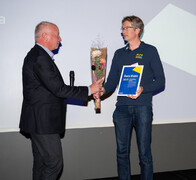 Anders Wennberg, Ordförande i träning och kappseglingskommittén Lidingö Jolleseglare, tar emot priset från Olof Granander, Förbundsordförande Svenska Seglarförbundet. Foto: Svenska Seglarförbundet