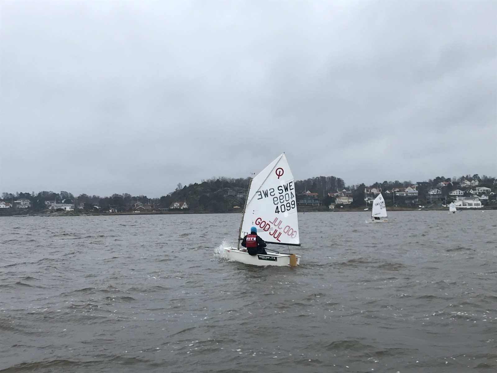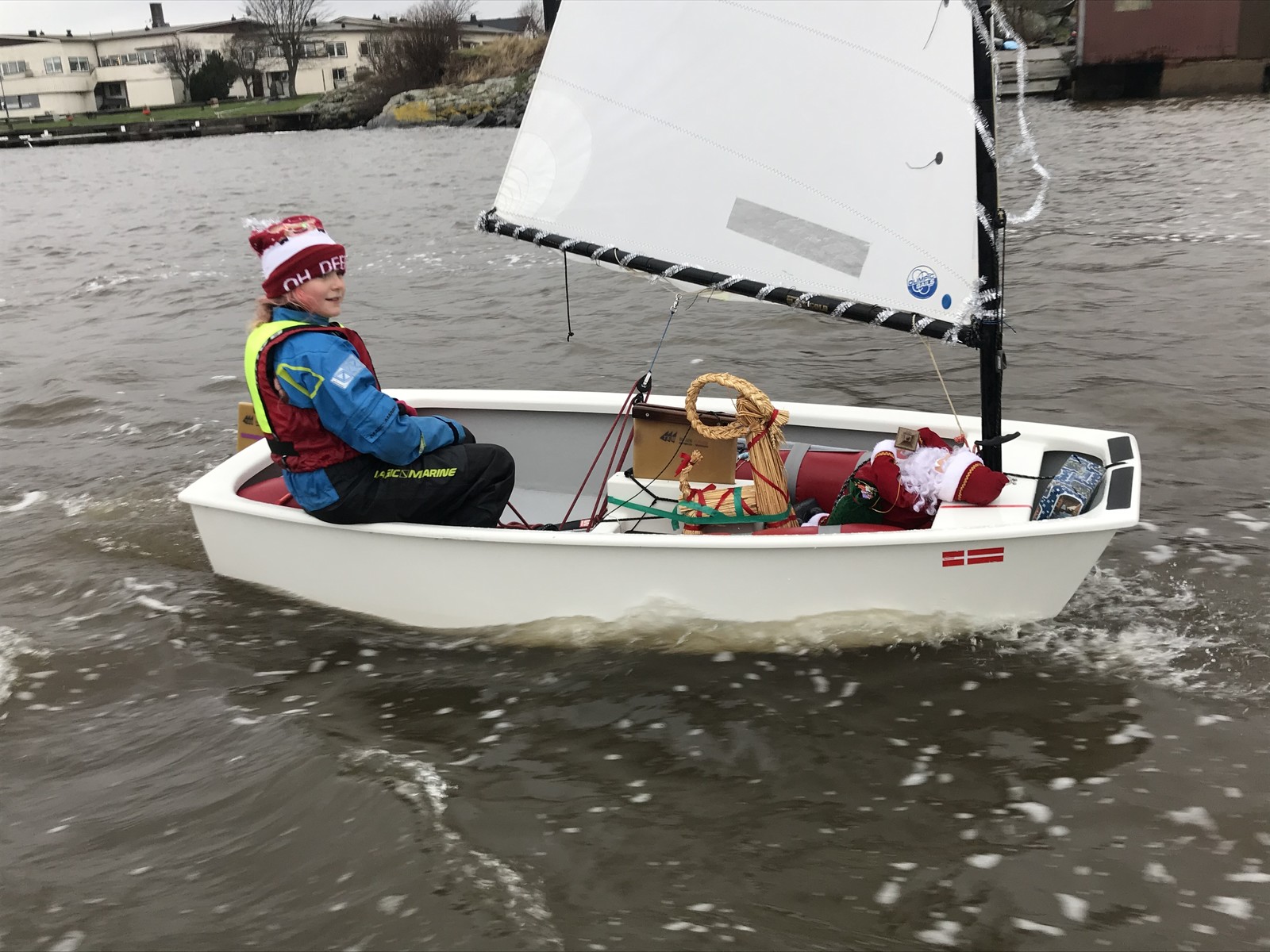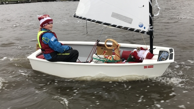 Dagens vinnare i Optimistklassen, Jonatan Röijer, hamnade bra i pyntklassen med ”God Jul” i seglet.