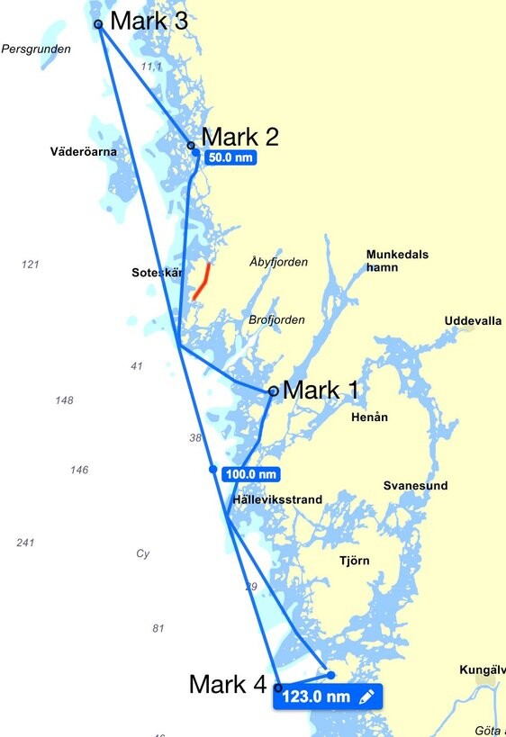 Banan sträcker cirka 123M och består av fyra märken, samtliga babordsrundningar. Kunde inte vara enklare.