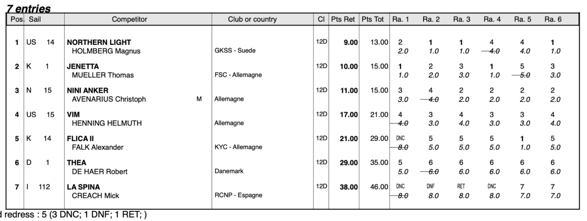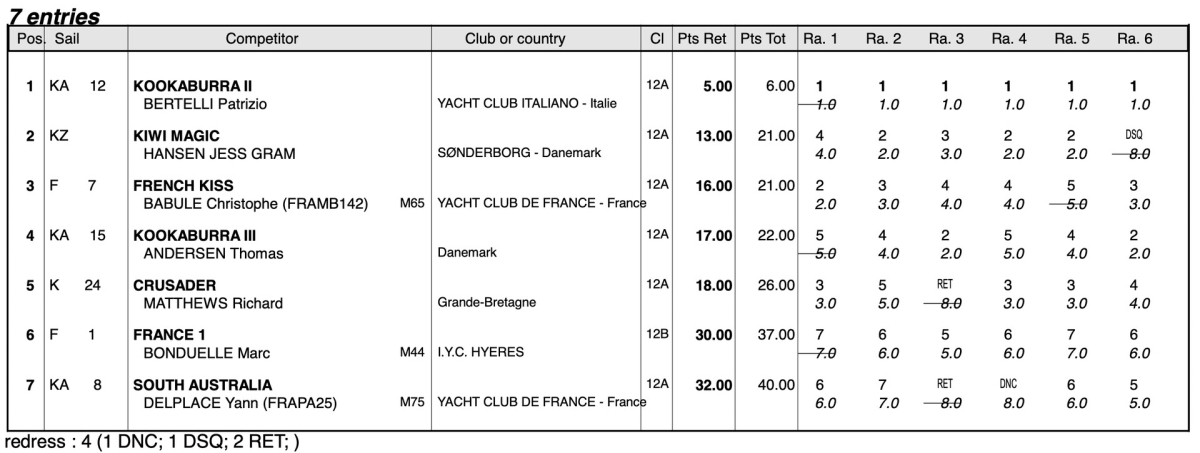 Trots att sista dagens race ställdes in på grund av den starka mistralen (22-36 knop) lyckades arrangören Yacht Club de Porquerolles hinna köra igenom de sex racen som krävdes för ett godkänt världsmästerskap så att två segrare kunde utses; svenska Northern Light (US-14) (vintagedivisionen) med Magnus Holmberg till rors och italienska Kookaburra II (KA-12) (Grand Prix-divisionen).