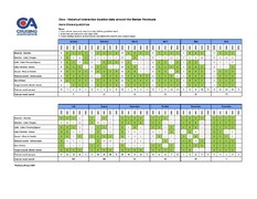 Historiskt sett har antalet interaktioner varit relativt lågt mellan december och mars. Det är inte heller många båtar som passerar området under den perioden. Grön färg markerar var det inte har förekommit några interaktioner alls med avseende på plats och period. Tabellen kommer att uppdateras i slutet av varje månad. Röda siffror visar antalet interaktioner.