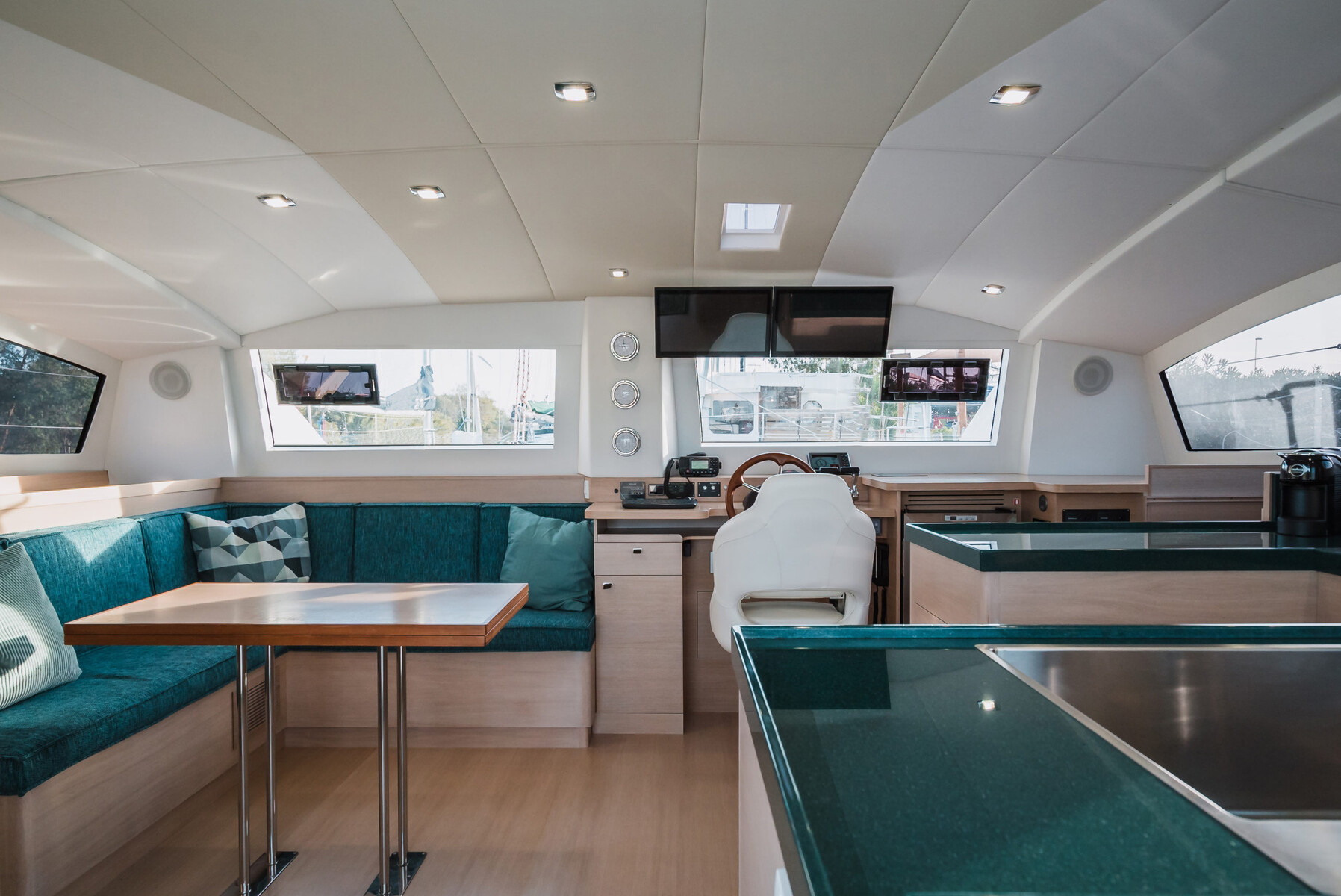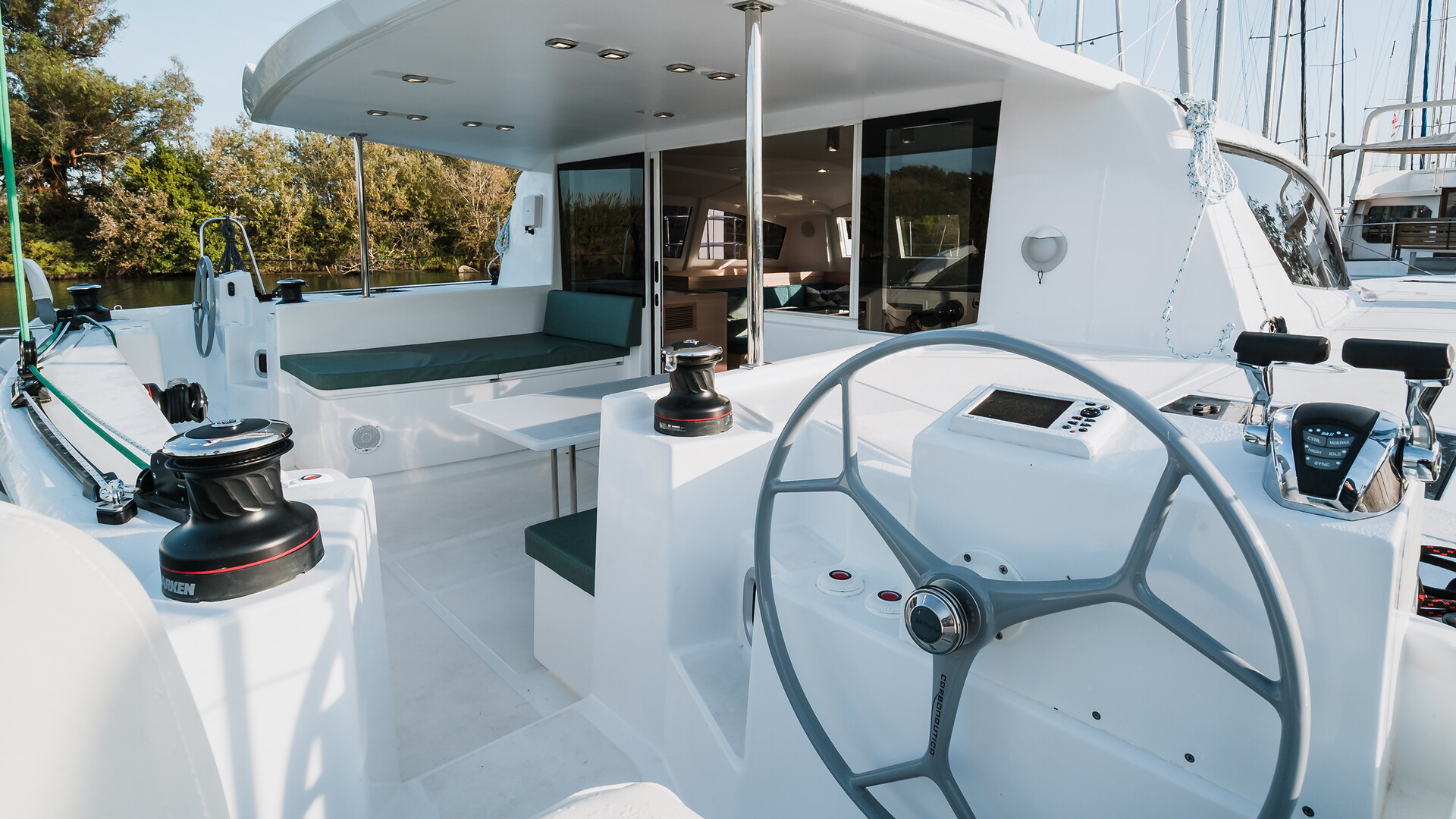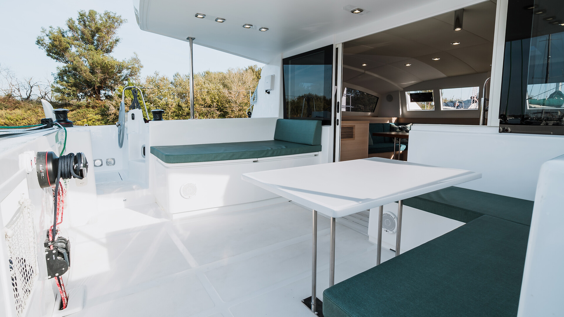 C-Cat 48 har ett stort, sammanhängande utomhusområde. Sittbrunnen skyddas av en stor bimini som vid behov kan stängas helt. Sittbrunn och salong ligger på ett och samma plan och avskiljs med en skjutdörr i glas.