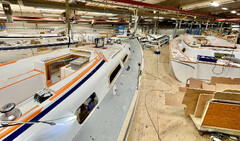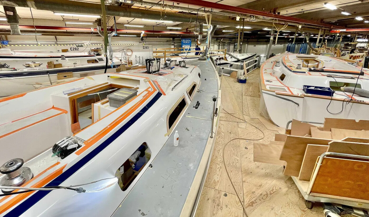 Första exemplaret av nya Hallberg-Rassy 370 kommer att vara i produktion för allmän beskådning under Öppet Varv den 22-24 augusti 2025 och kommer att segla under hösten 2025. Fotot visar dock produktionen av 400. Foto: Hallberg-Rassy