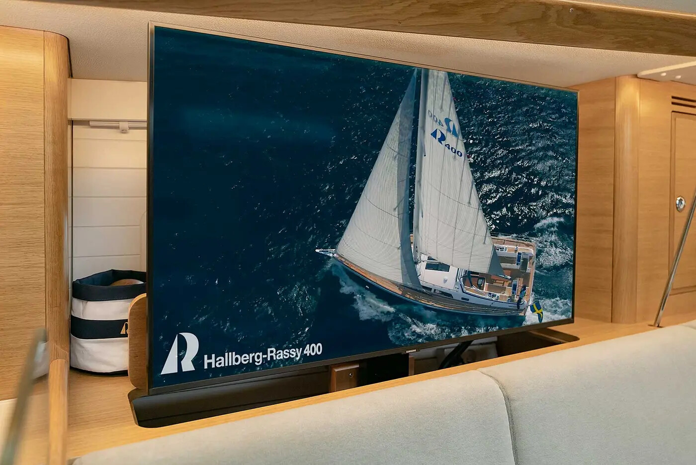 Hallberg-Rassy har en förkärlek till subtil lyx så varför inte en "infällbar" TV (tillval). Den går likaväl att installera på babord som styrbord sida. Foto: Hallberg-Rassy
