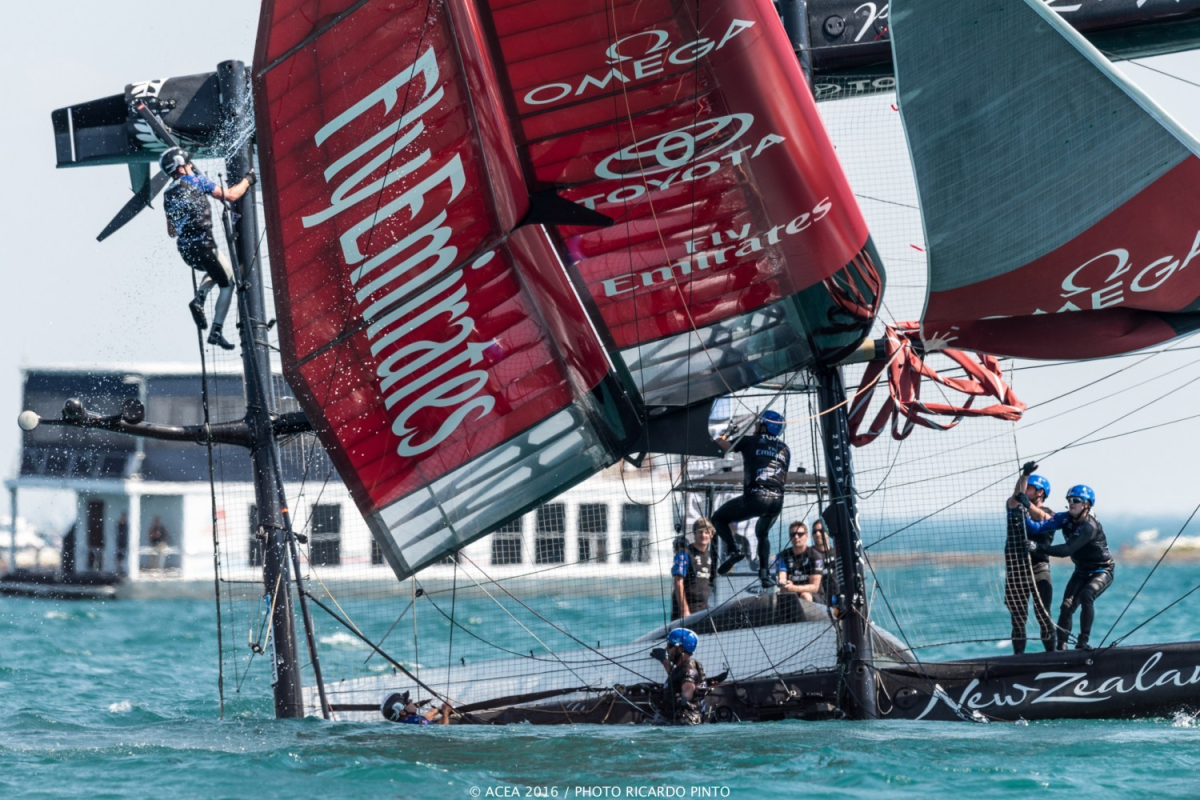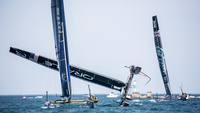 Senare idag går första startskottet av Louis Vuitton America’s Cup World Series Chicago. Igår var det träning under vilken Emirates Team New Zealand och ORACLE TEAM USA bjöd publiken på en spektakulär show. Båda teamen kapsejsade. Kiwilaget var först ut. Sedan Oracle. Ingen seglare skall ha kommit till skada.