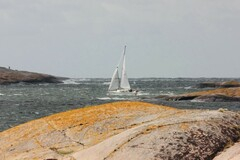 I den västliga vinden vid Åstol minskar vinden igen och vi känner oss glada som behöll genuan. Väl ute på den goa Marstrandsfjorden ökar vinden igen och går tillbaka något mot syd en kort stund, men sedan sträcker vi Hätteberget när vinden åter går tillbaka. Vinden ökar dock så mycket att vi tar beslut att byta till fock före Hätteberget och det är bara att slänga sig fram på fördäck och gilla läget. Det går fort och smidigt och snart har vi focken uppe och en stund senare har vi även rundat och nu är det bara att hänga med den kraftiga vinden.