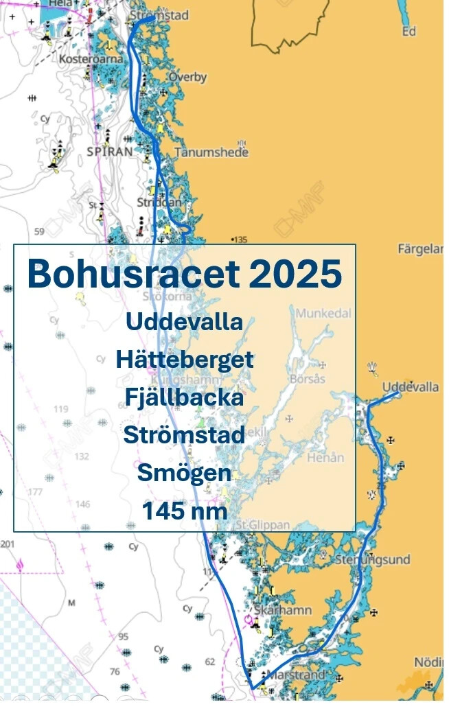 Vi startar som vanligt i klass 1 (för de minsta båtarna) där vi var den minsta båten. Vi startar bra i lovart i den nordliga vinden och kommer iväg först, men blir ifrånseglade av Expresserna i lä på fart och när ett rejält skifte till väst kommer blir det kryss strax före vi kommer till Uddevallabron och vi lyckas tajma skiften väl. Expresserna håller vi på behörigt avstånd och sniker grundet vid Stången och faller av för att segla söderut innanför Orust. Spinnacker åker upp och vi kör nu på favoritbogen med Accenten, en lätt och brant halvvind med spinnen uppe.