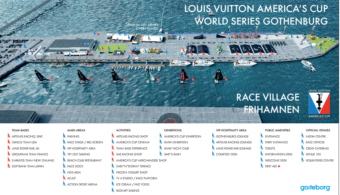 Evenemanget i Göteborg har två centrum – det 50 000 m2 stora evenemangsområdet i Frihamnen och den publikvänliga seglingsarenan i Långedrag. I Race Village i Frihamnen bjuds det in till en folkfest med fri entré för stora och små med serveringar, prova-på aktiviteter och underhållning. Här kan publiken se tävlingsbåtarna när de inte tävlar, komma nära lagens baser samt följa seglarna när de kliver ombord på båtarna och den stora prisutdelningen på söndag. I Race Village kan man också följa den högklassiga TV-produktionen från seglingen på storbildsskärmar. Se programmet för aktiviteterna i Frihamnen här.