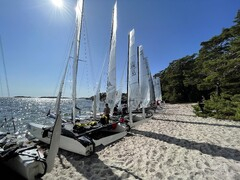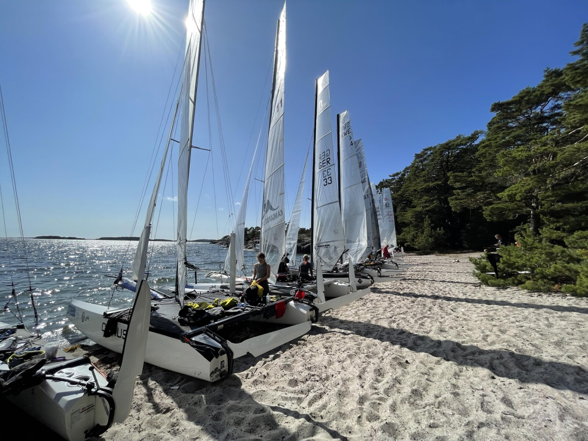 Första dagens seglingar bjöd på sol, 20 knop (vind) och härliga undanvindsrepor. Dag två inleds med tidig frukost och start klockan 08:00. Målet är att ta sig till Lidö innan vinden ökar sent på eftermiddagen.