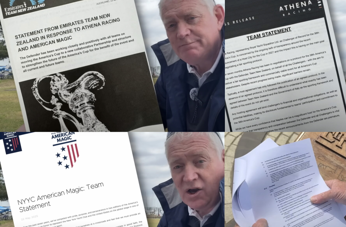 På åtta minuter lyckas Matthew sammanfatta den senaste tidens pressmeddelanden, skarpa kommentarer och hot att dra sig ur cupen. Matthew tittar dessutom på vilka förändringar som kan vara på gång nu när försvararen Emiratez Team New Zeeland svarat på kritiken genom att offentliggöra det ännu inte överenskomna utkastet till protokollet.