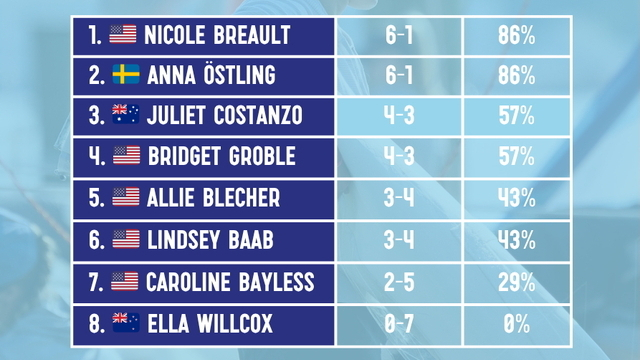 Nicole Breault och hennes Vela Racing Team (tvåa i första deltävlingen Casa Vela Cup i San Francisco) öppnade starkt och ligger i ledning. Men Team WINGS är amerikanarna hack i häl. Båda lagen avslutade första roundrobin (av totalt två) med sex segrar och en förlust. Våra svenska stjärnor seglade sig igenom turneringen hela vägen fram till sista matchen mot just Vela Racing Team där två straffar satte käppar i hjulet.