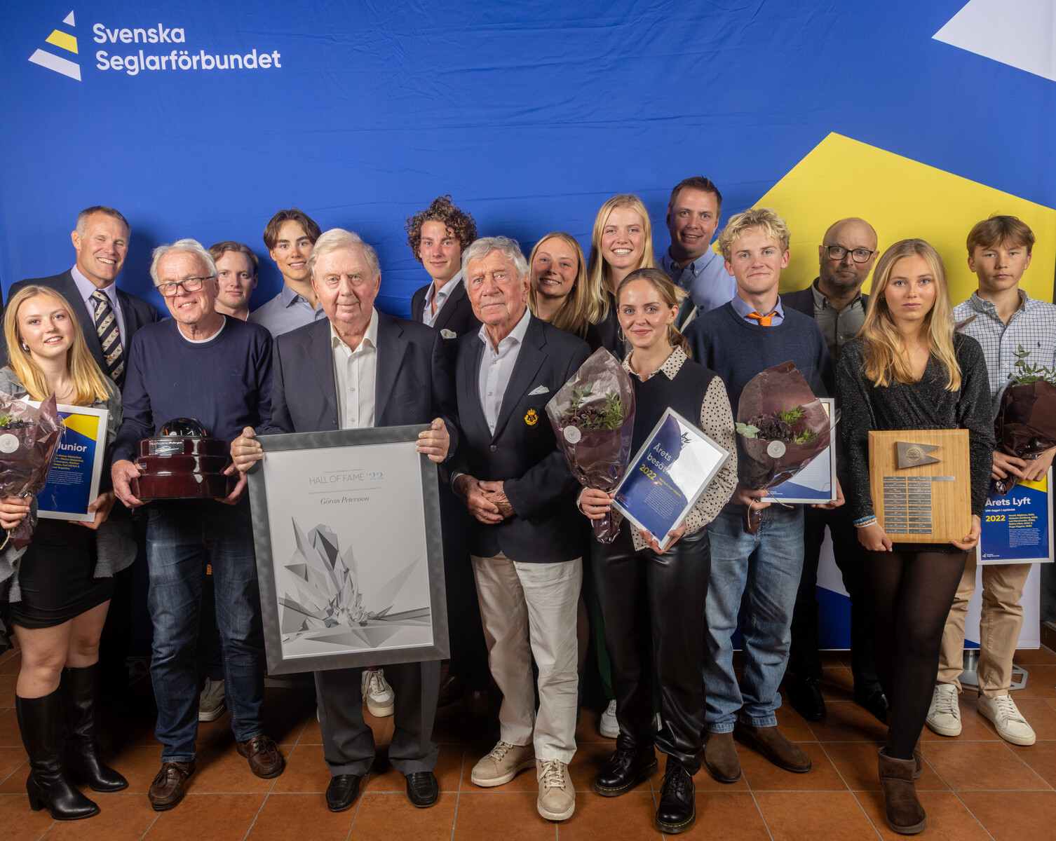 2022 års prisade seglare, från vänster: Martina Carlsson, Anders Dahlsjö, Christer Båth, Olle Aronsson, Erik Norlén, Göran Petersson, Marius Westerlind, Pelle Petterson, Rebecca Netzler, Vilma Bobeck, Hedvig Liljegren, Martin Strömberg, Hugo Liljegren, Patrik Forsgren, Selma Hård, Hugo Flygare. Foto: Daniel Stenholm