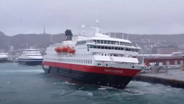 I januari i fjol hamnade ett av Hurtigruttens fartyg; Nord-Norge, i en prekär situation i Bodø hamn. Fartyget var på väg in i hamn när det plöstligt blåste upp till kraftig storm. Trots att fartyget trycktes mot land av vindbyarna med väldig kraft lyckades Kapten med besättning, med hjälp av ankare och full motorkraft, minimera skadorna. Vi lyfter på hatten (bild ovan)!