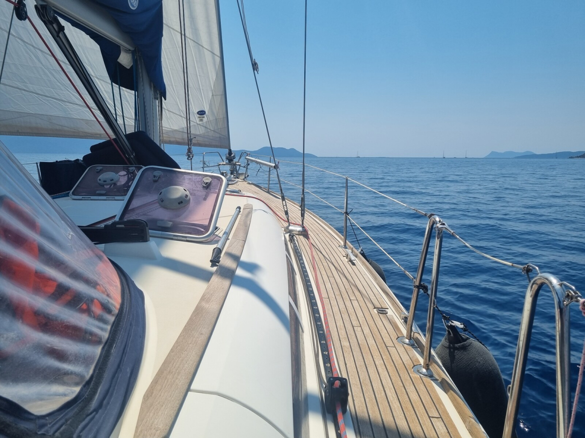I oktober 2023 åkte vi ner till Korfu och provseglade båten tillsammans med säljaren. Det var en speciell situation att bo och leva tillsammans, köpare och säljare. Men fördelarna med att få chansen att bo på båten i flera dagar och verkligen kolla alla utrymmen ordentligt var ovärderliga. Medan vi seglade och båten var i vattnet hittade vi inget allvarligt som kunde stoppa oss från att köpa båten. Vi väntade dock på att båten skulle upp på land så vi kunde kolla botten. Båten lyftes upp på land och vi hittade inget som vi inte redan visste där heller så vi ringde banken och slog till!