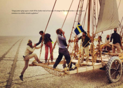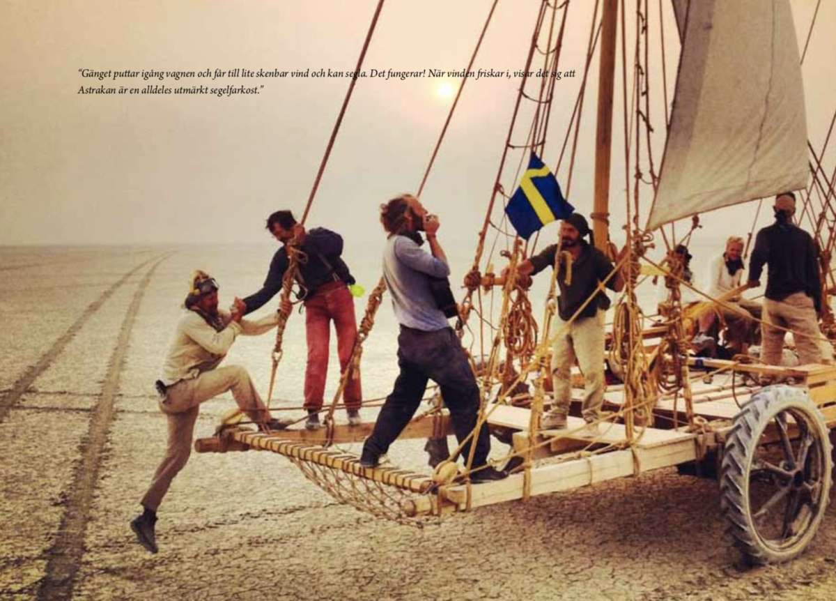 ”Som mest lyckas vi jaga upp ”Astrakan” i 43 km i timmen men det känns som hon har mer att ge i stabil vind. I öknen är det ofta väldigt byigt och vi får ta det försiktigt. När det friskar i står master och stänger plötsligt som krumma fiskespön, lovarts bakhjul lyfter en meter över marken av draget från storriggen och det står en kvast av damm från lä bakhjul. Besättningen samlas i lovart akter för att kränga ner. Rorgängaren faller av allteftersom vagnen accelererar och den relativa vinden blir skarpare. Rårna är brassade för lätt bidevind. I princip är det som att segla en isjakt. Även i lätt vind kan man nå otroliga hastigheter. Största faran är att slacka rep, som skot och halsar, kan fastna i traktorhjulen. Skulle det hända dras riggen utan tvekan ögonblickligen ner. Det är en ren adrenalinkick att segla ett skepp i full fart över öknen, och adrenalin är den perfekta drogen, man kan aldrig få nog.”