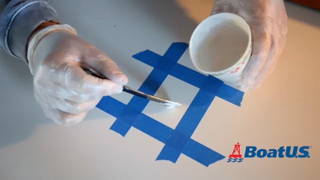 Tejpa runt skadan så att du enbart håller dig till den skadade ytan och inte kladdar runt på andra ytor. Ta bort alla lösa delar och slipa ner ytan med grovt sandpapper så att den nya gelcoaten sitter bättre. Gör sedan rent ytan med aceton.